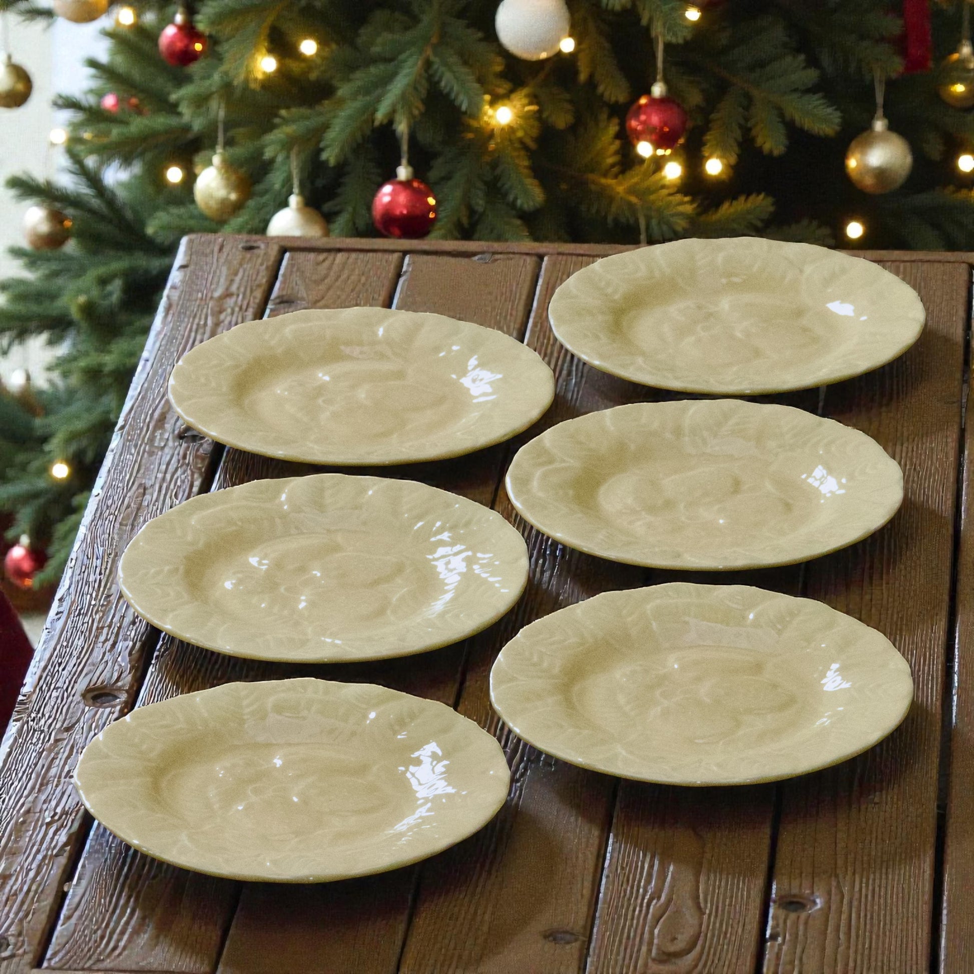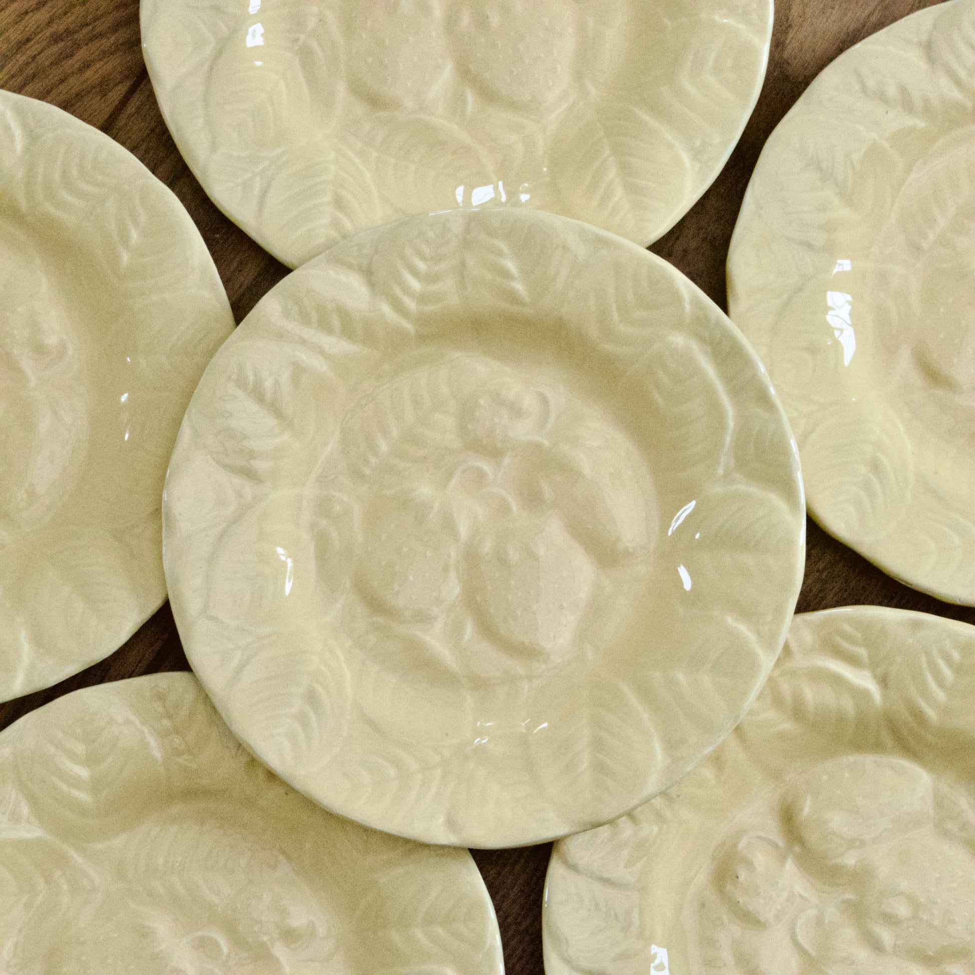 6 assiettes en barbotine fraises jaunes signées Genevieve Lethu