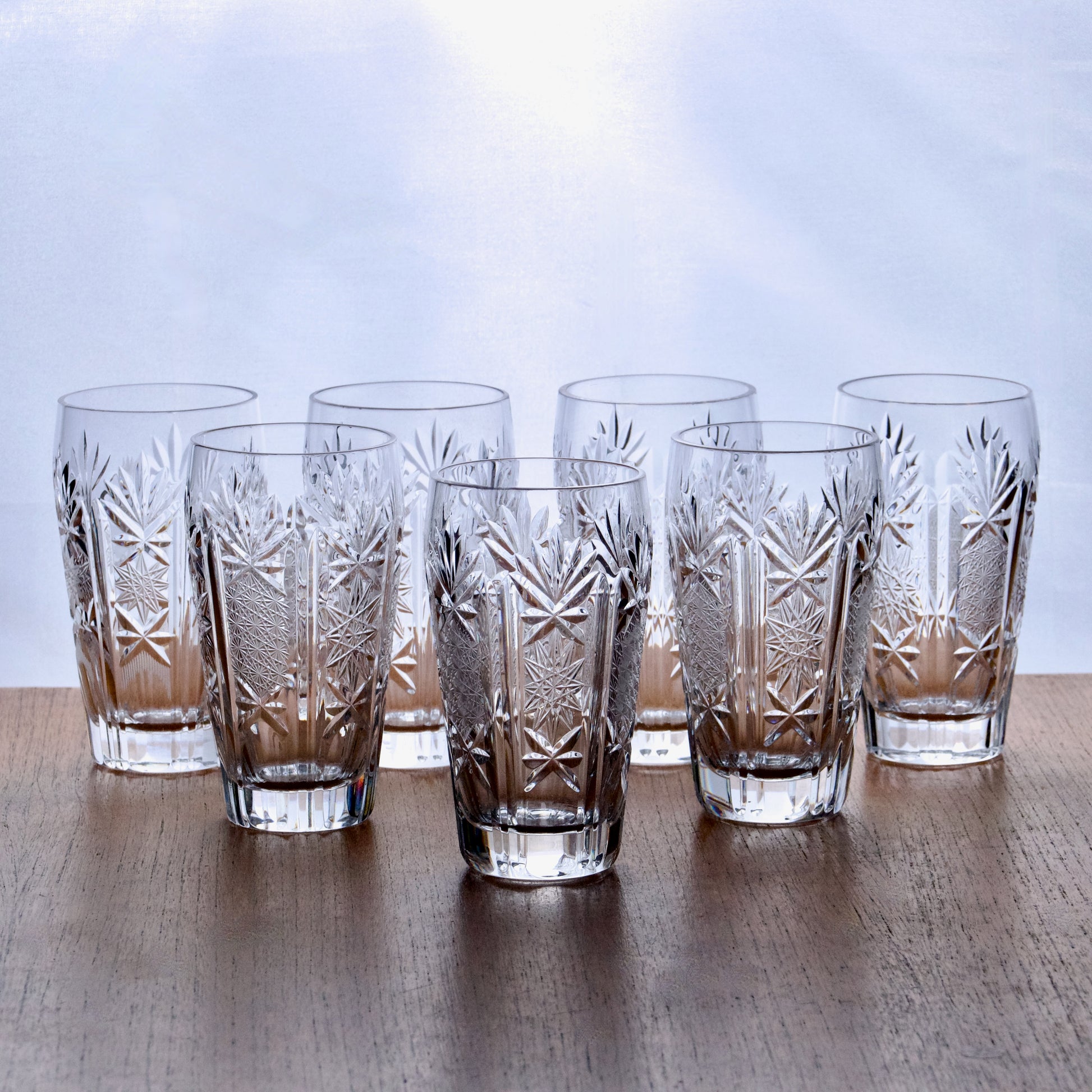 Ensemble de 7 très élégants verres anciens en cristal soufflé-moulé et taillés à la roue.