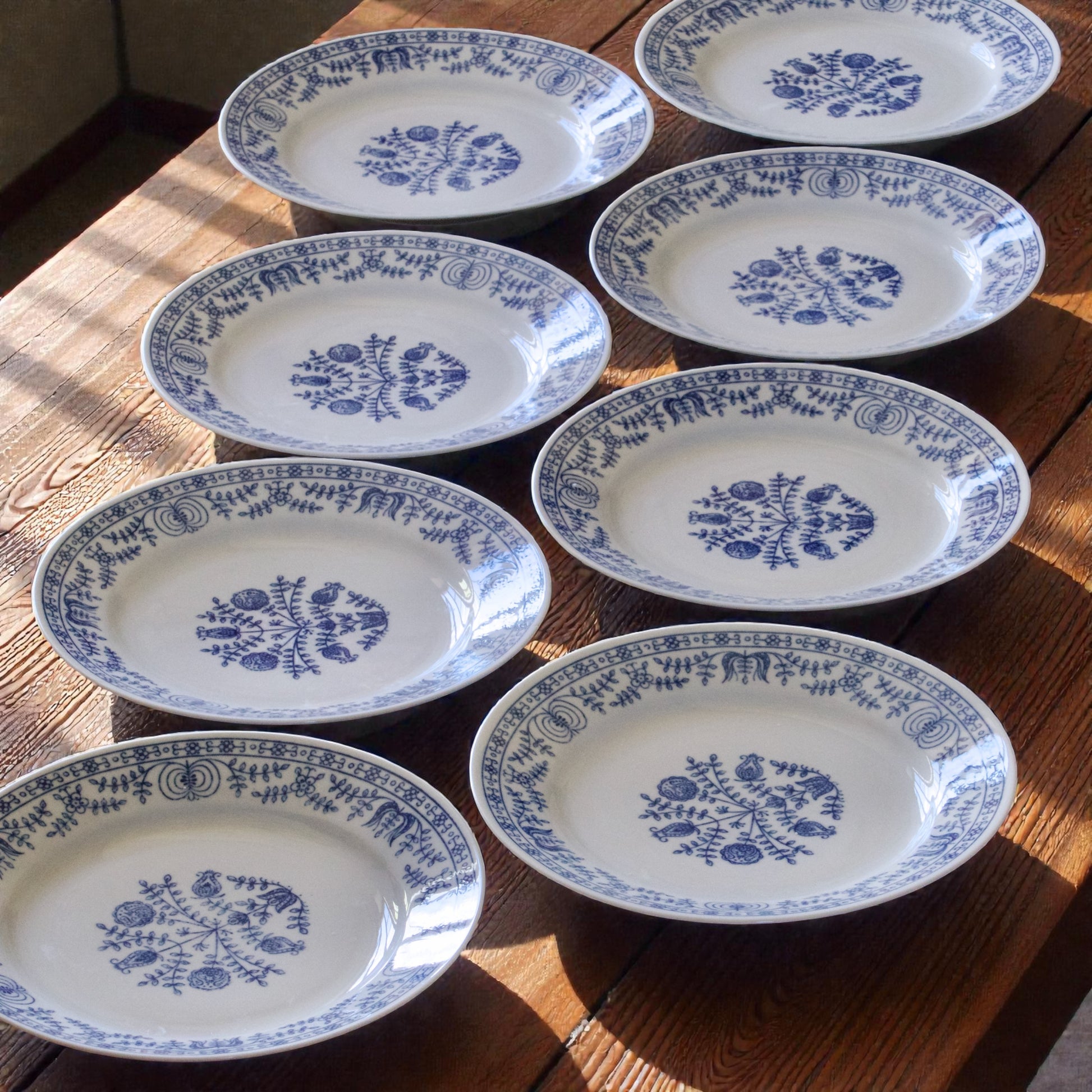 Lot de 8 assiettes plates vintage en porcelaine allemande signées Kahla, German Democratic Republic, circa 1970.