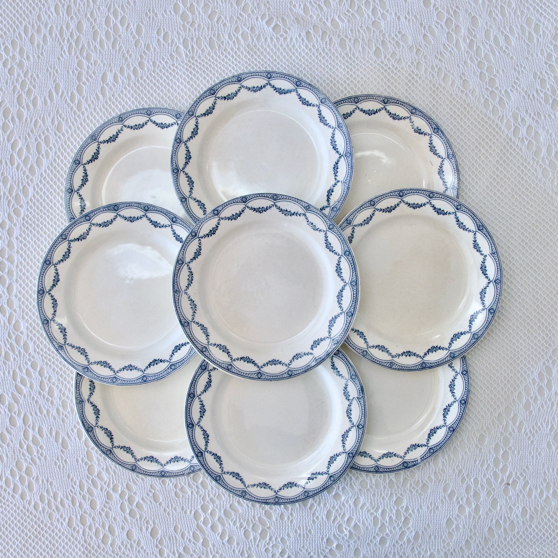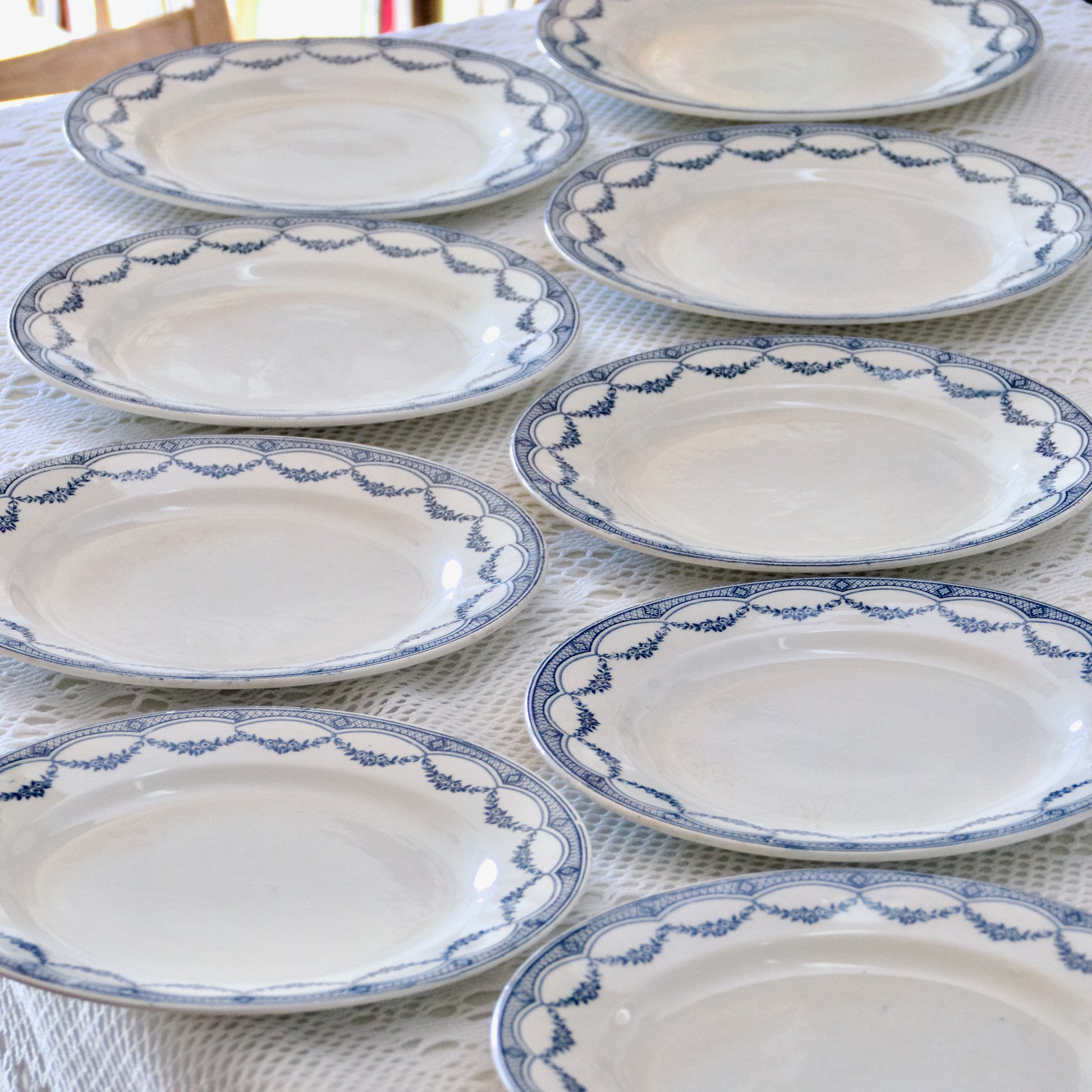 Ensemble de 9 très jolies et grandes assiettes plates anciennes, terre de fer, estampillées Salins (S.A.M.R) collection “Petit Trianon”.
