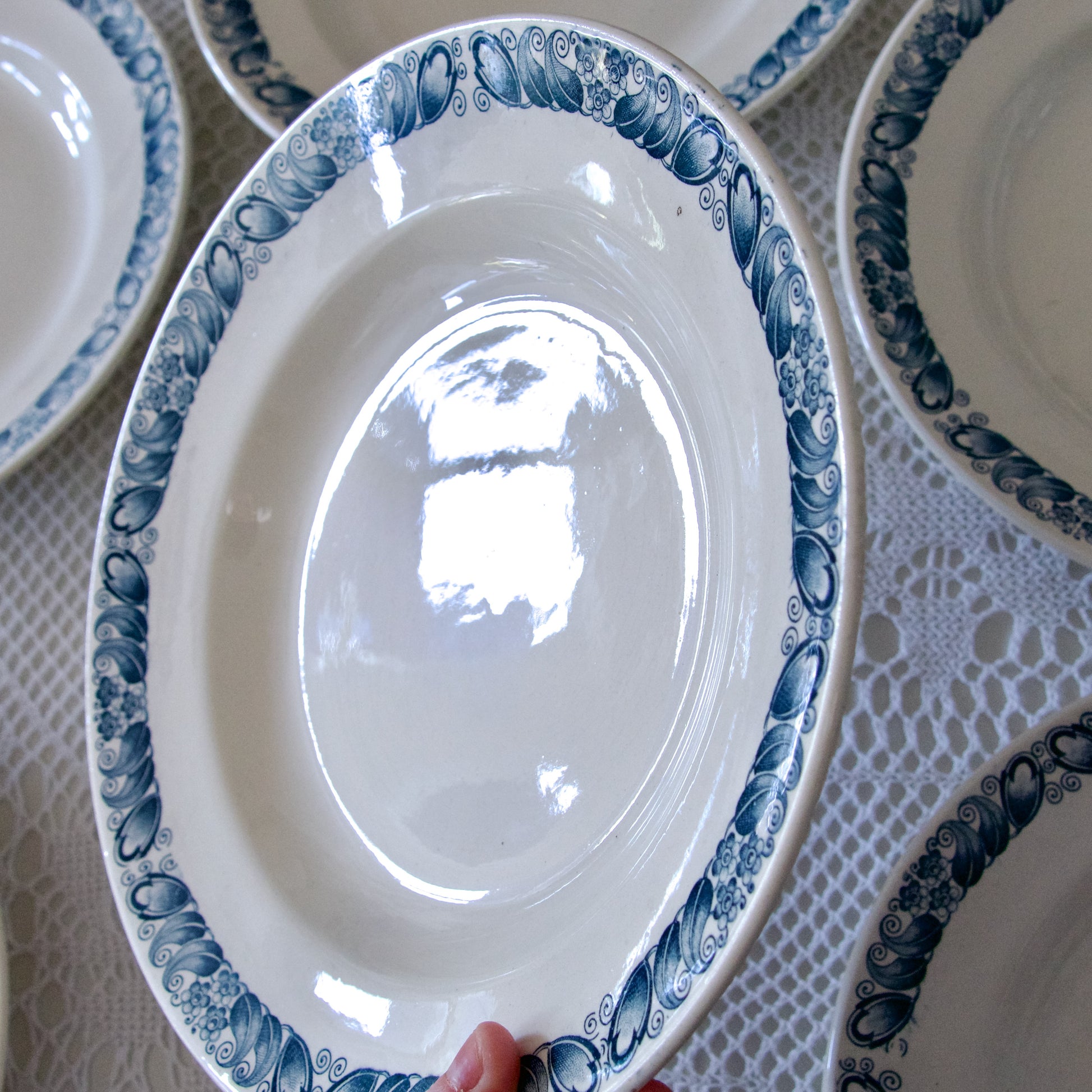 Décor d’une jolie frise végétale bleue Art Nouveau sur le marli.