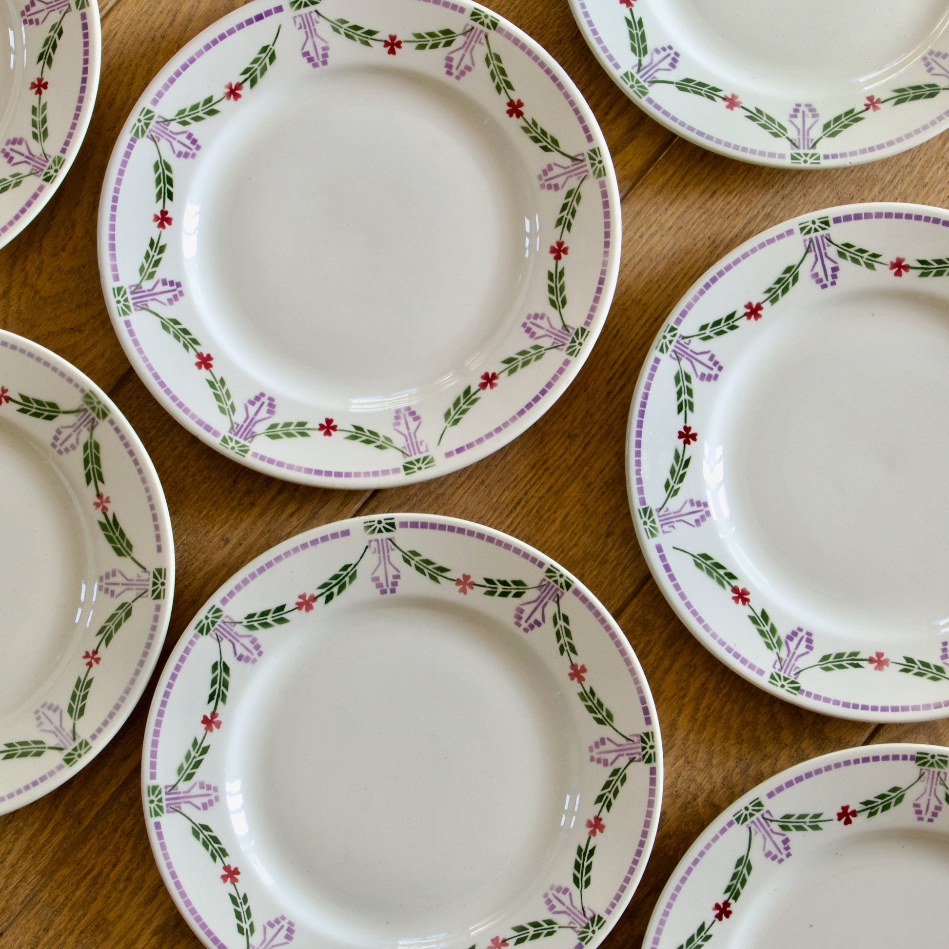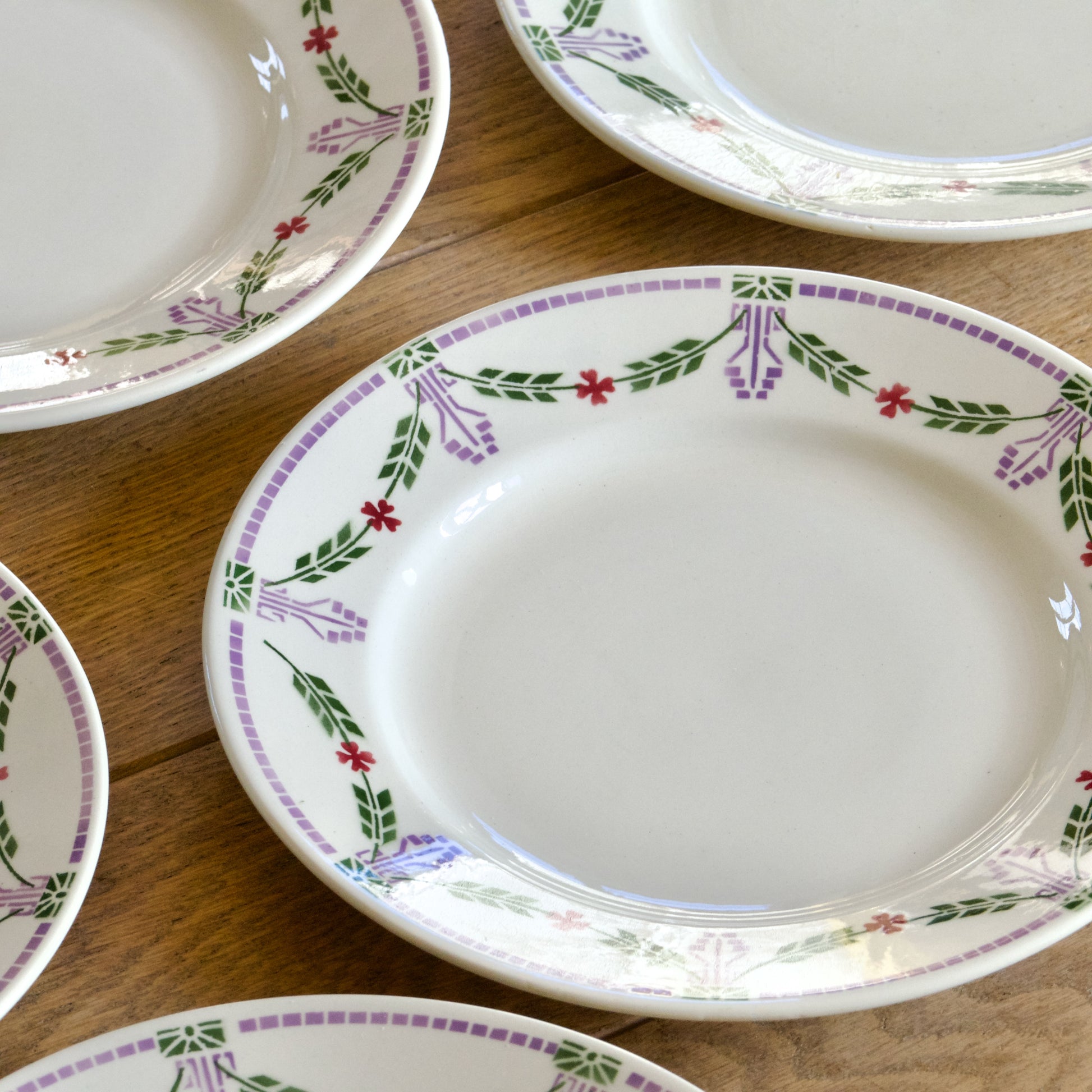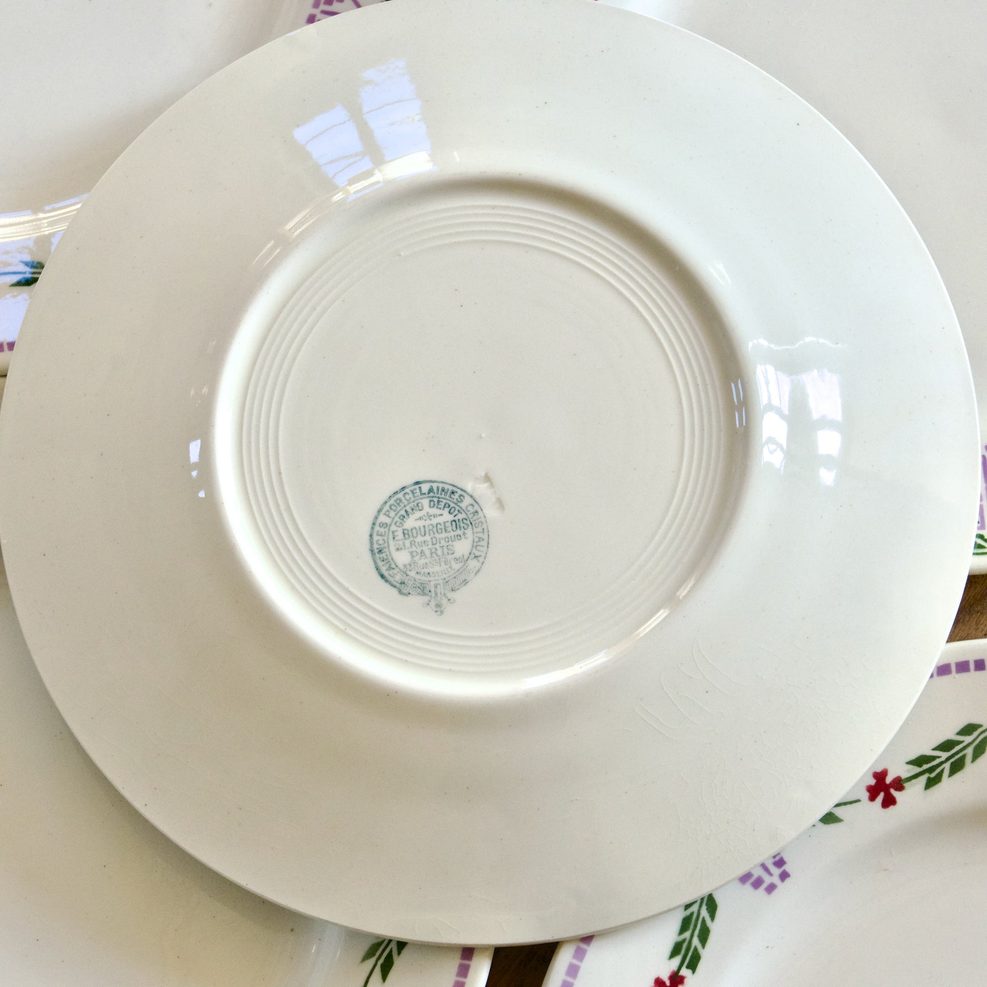 Ensemble de 7 magnifiques assiettes à dessert anciennes, circa 1920, estampillées Emile Bourgeois Drouot Paris.