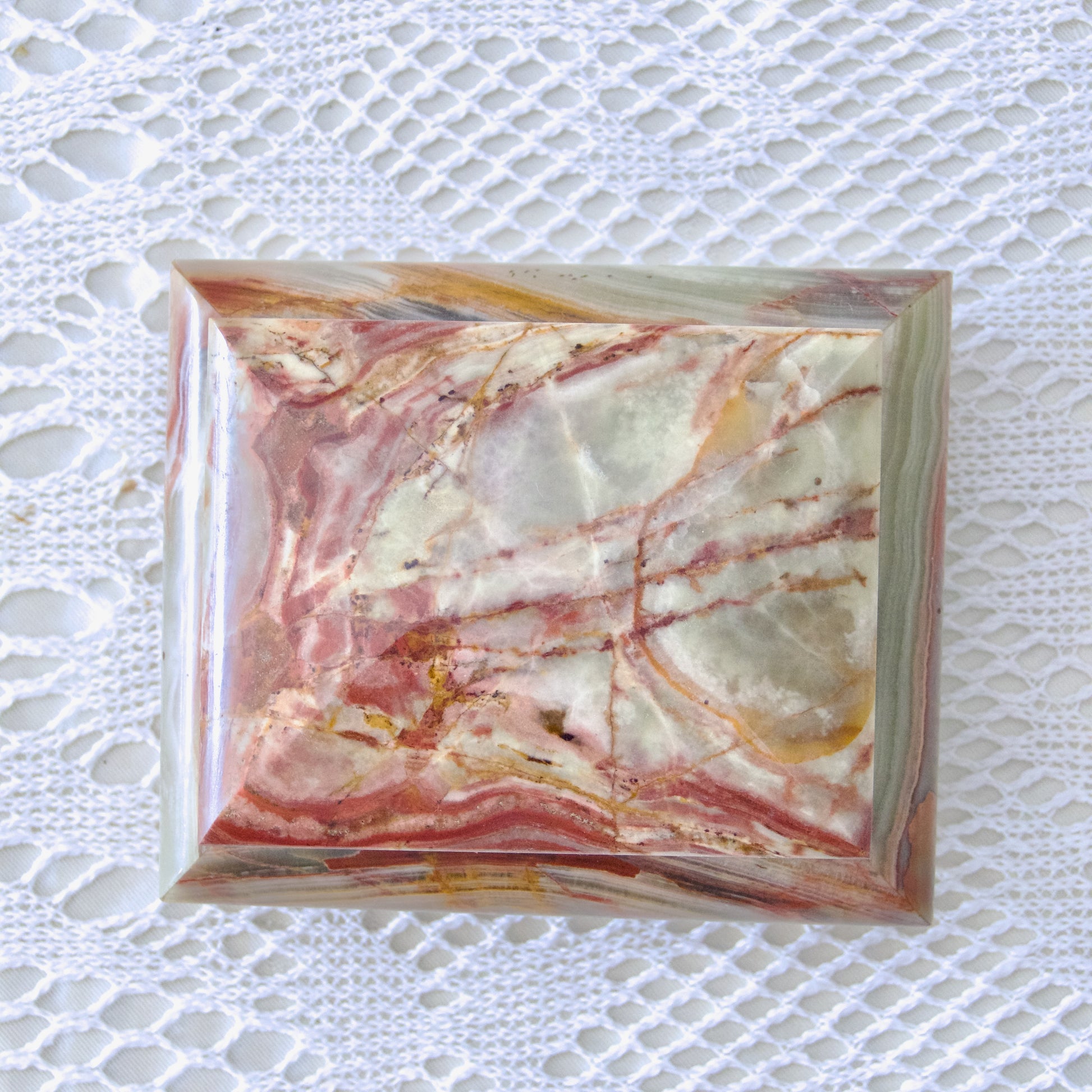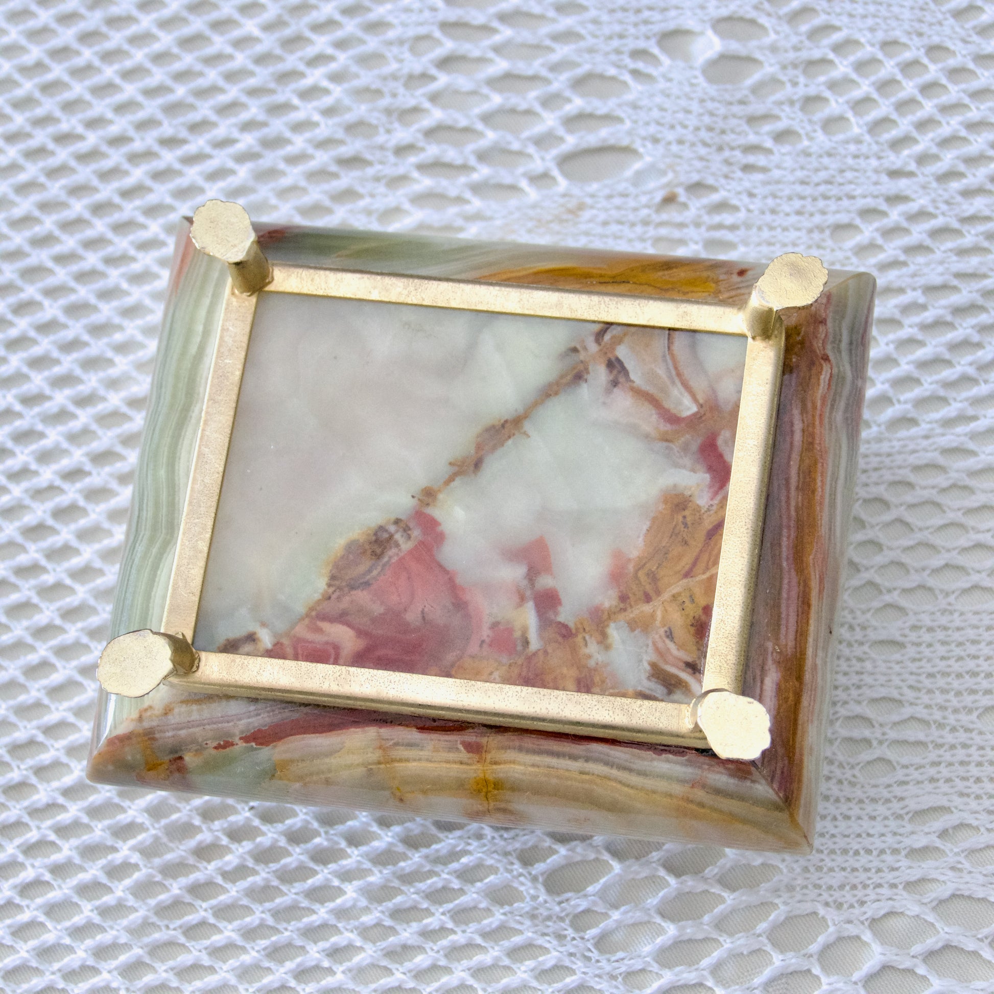 Très joli coffret à bijoux ancien en marbre onyx avec structure et pieds en métal doré, forme pattes de lion. Intérieur en velours rouge.