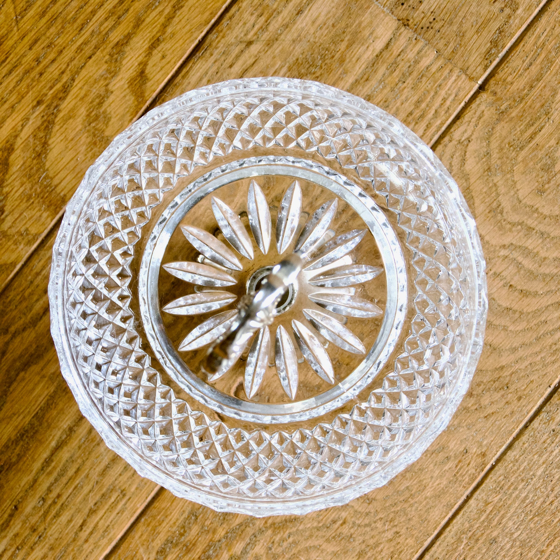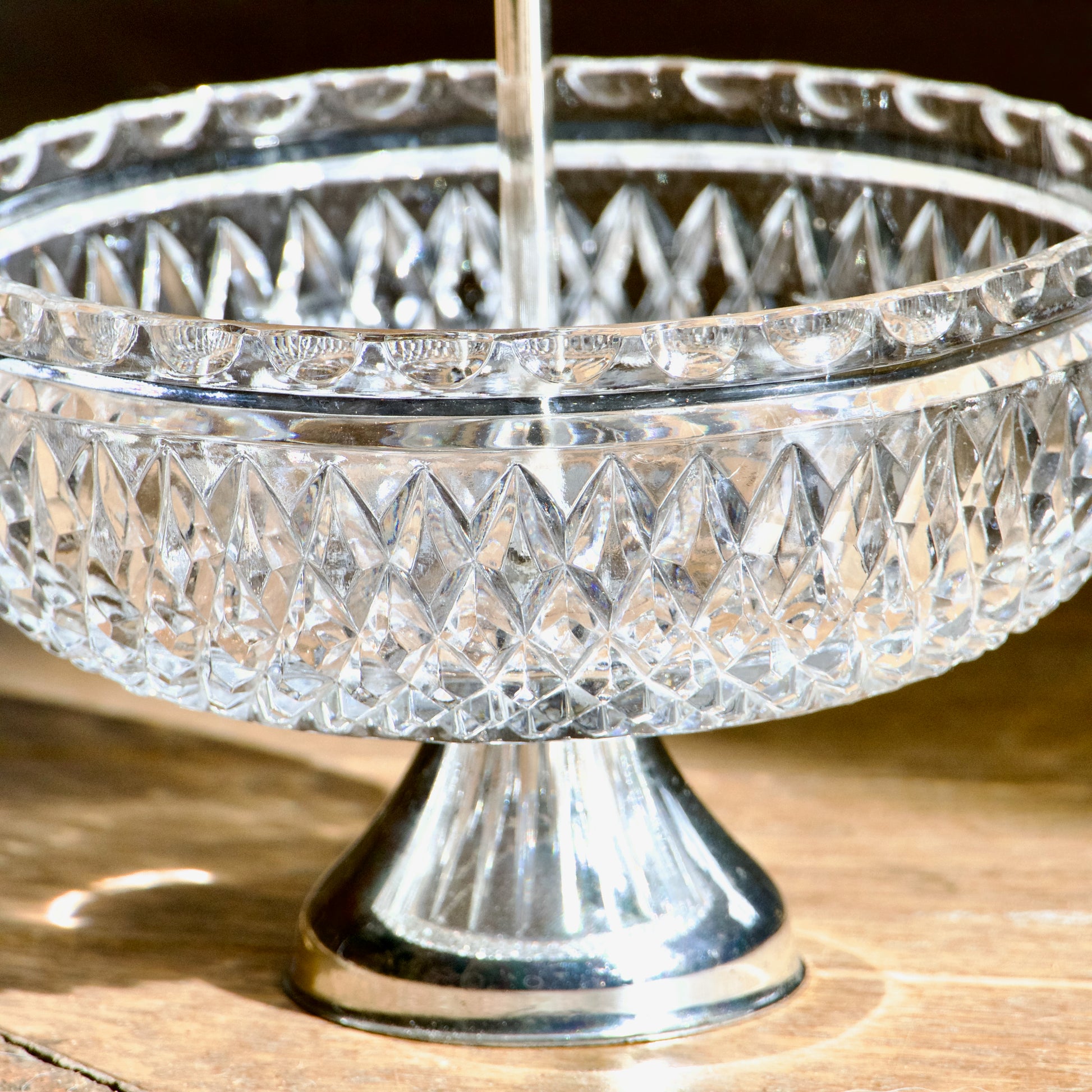 Magnifique coupe montée sur pied / corbeille ancienne en cristal ciselé et poignée centrale et pied en métal argenté, circa 1950.