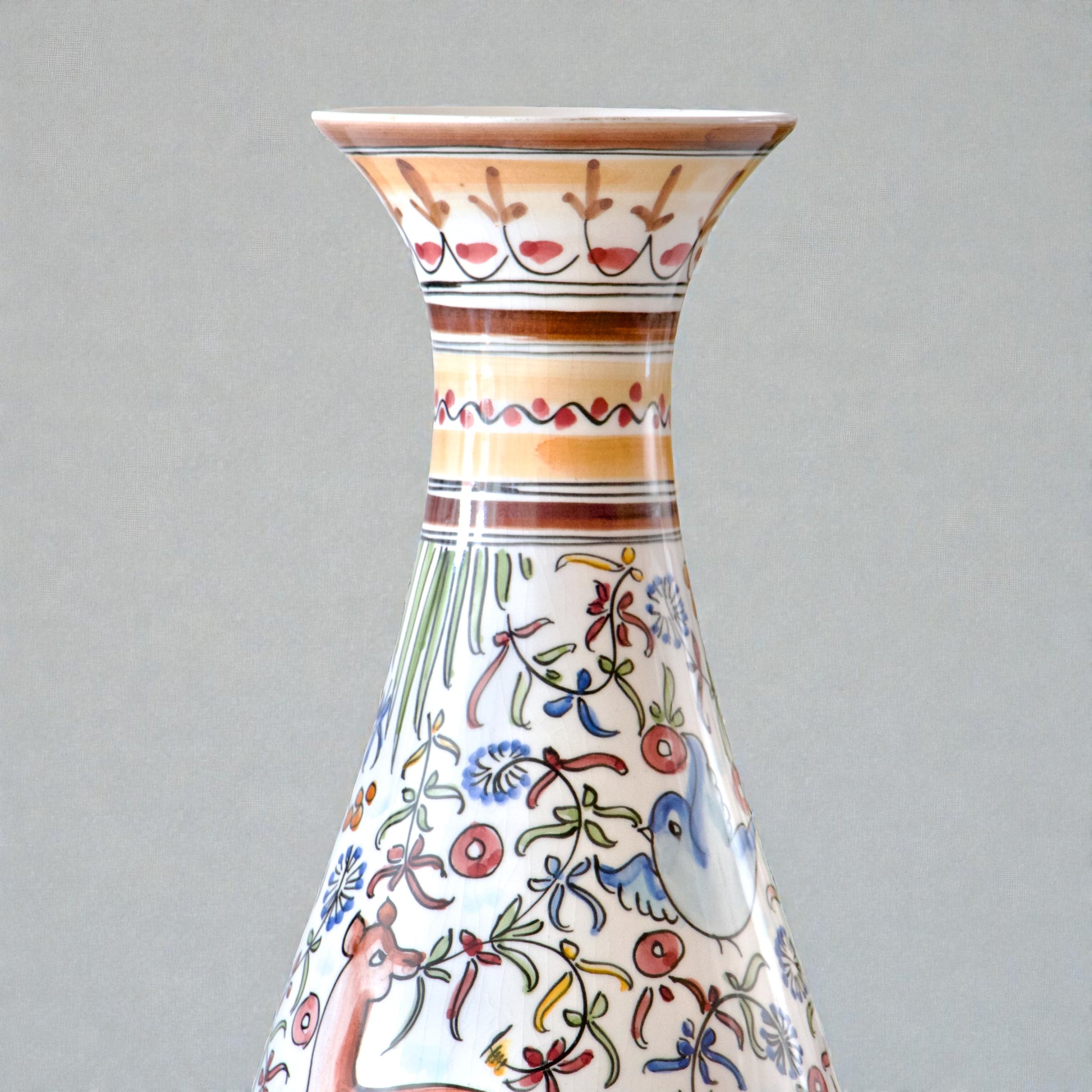 Grand vase artisanal portugais, céramique de Coimbra, au magnifique et riche décor entièrement peint à la main. Signé et numéroté.