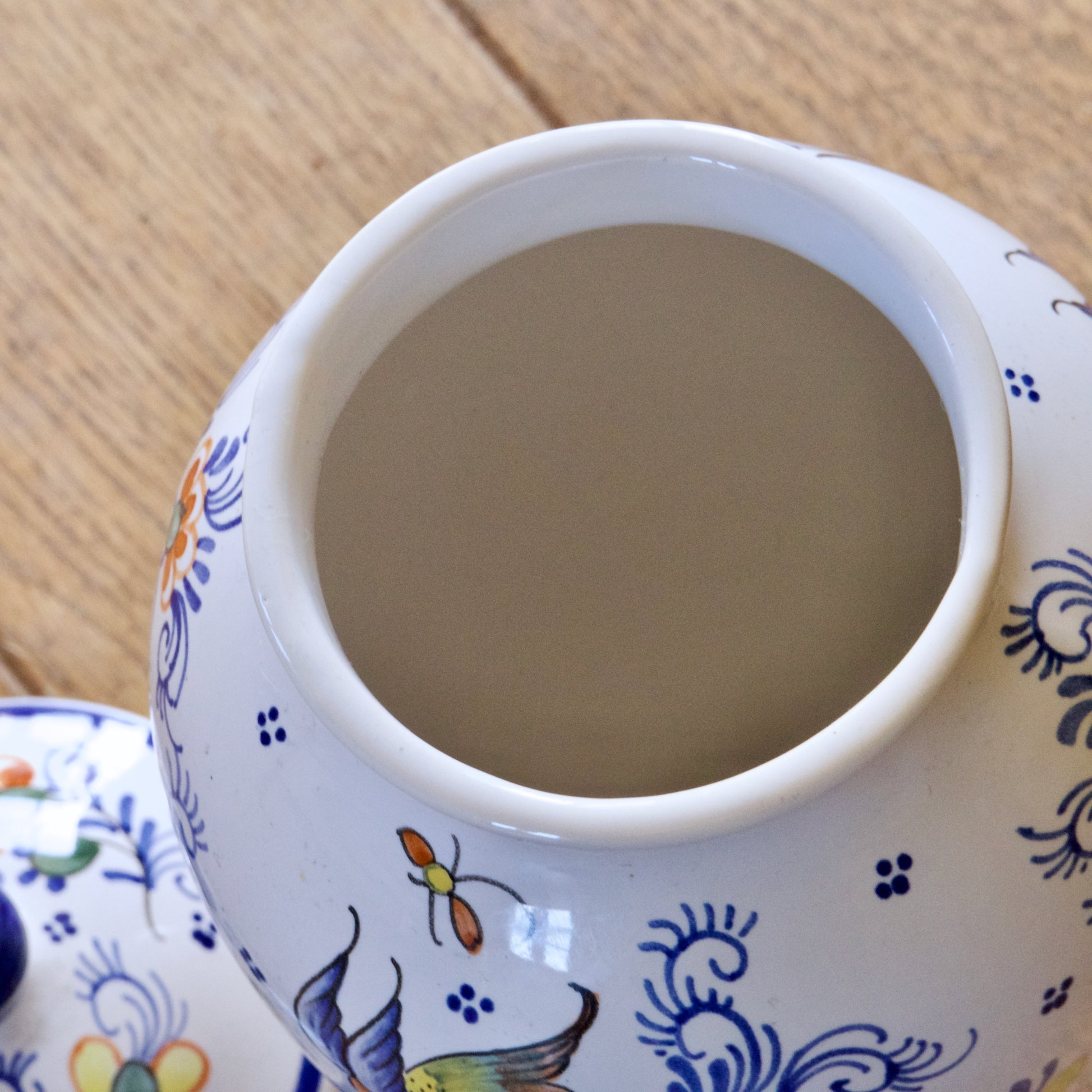 Grand vase couvert artisanal en faïence du Moustiers, oiseaux