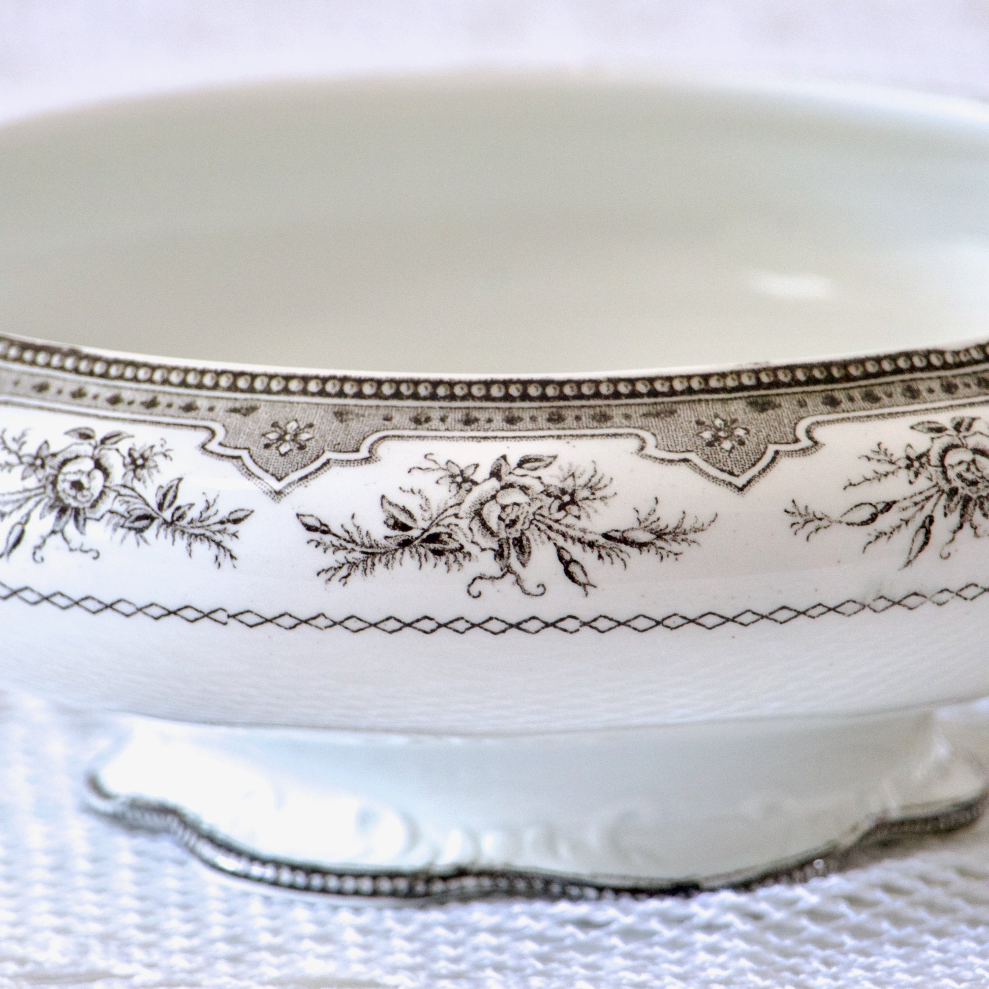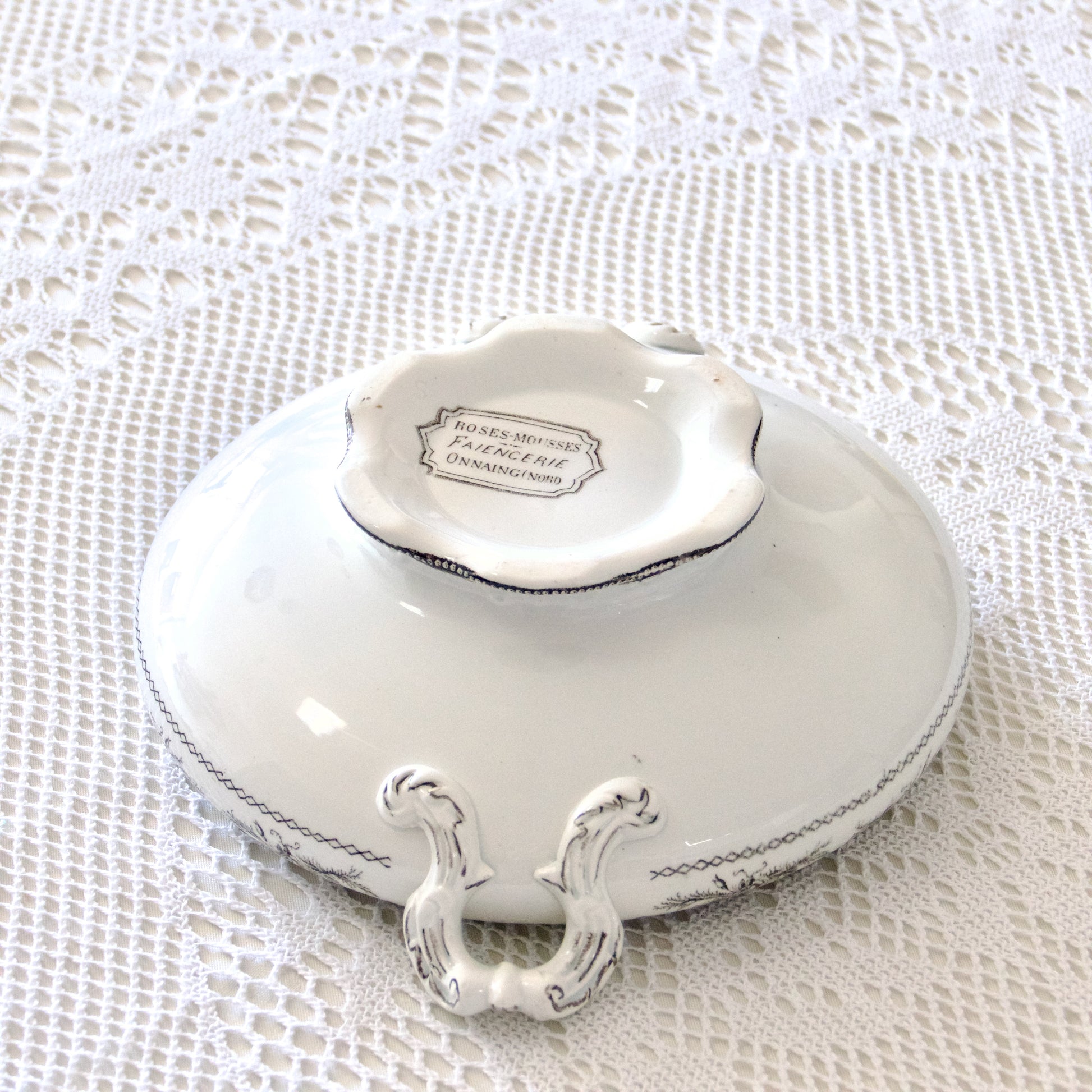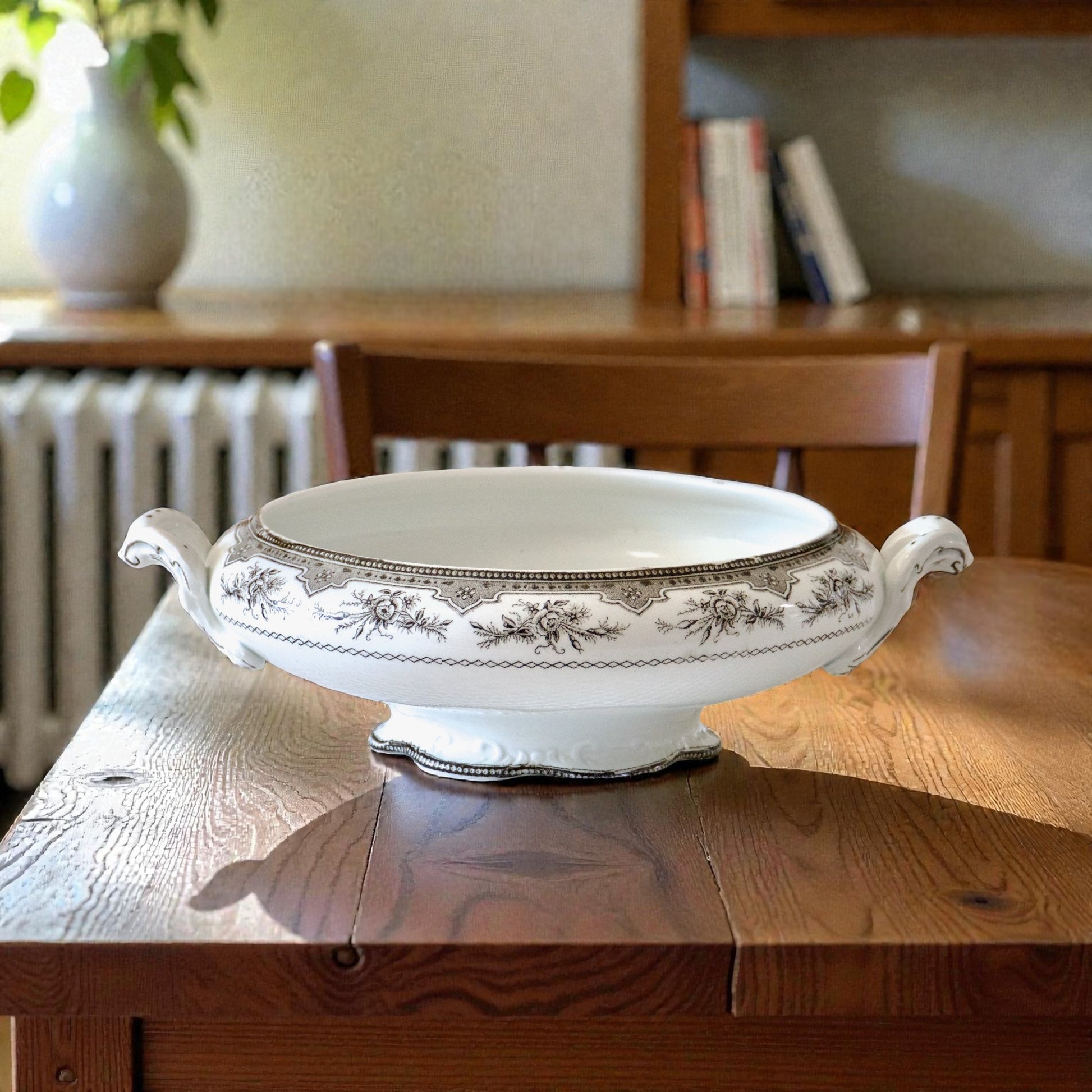Rare et très joli légumier / saladier (anciennement soupière) ancien fin XIXe, estampillé Onnaing collection “Roses-mousses” rare couleur sépia.