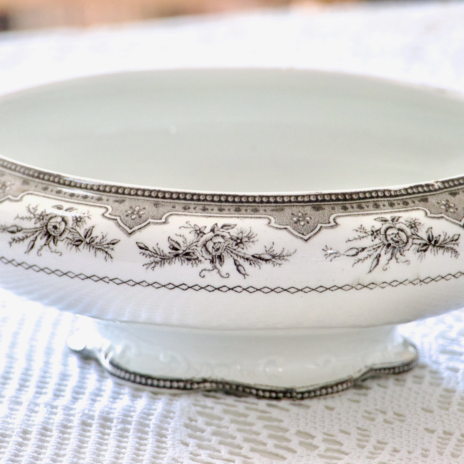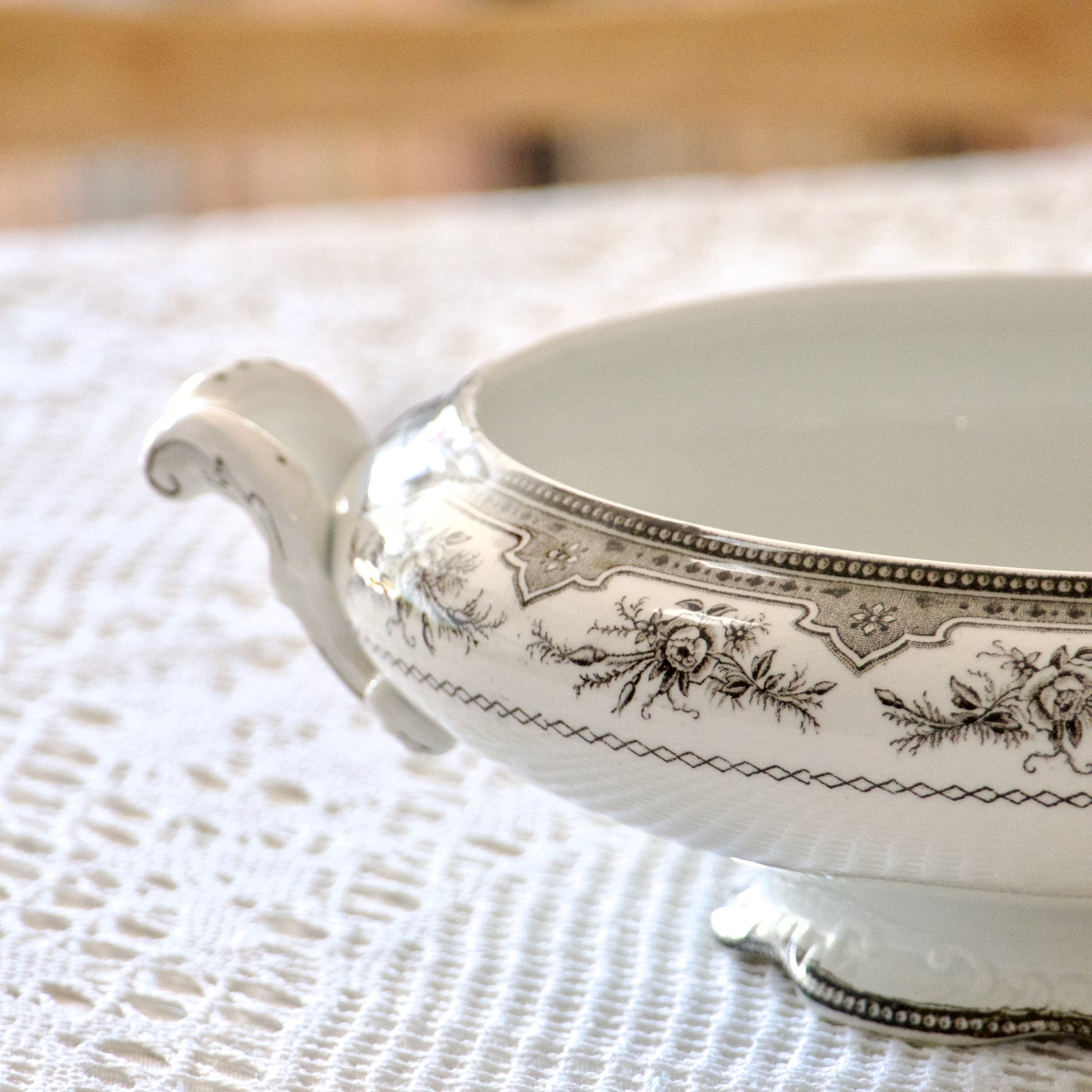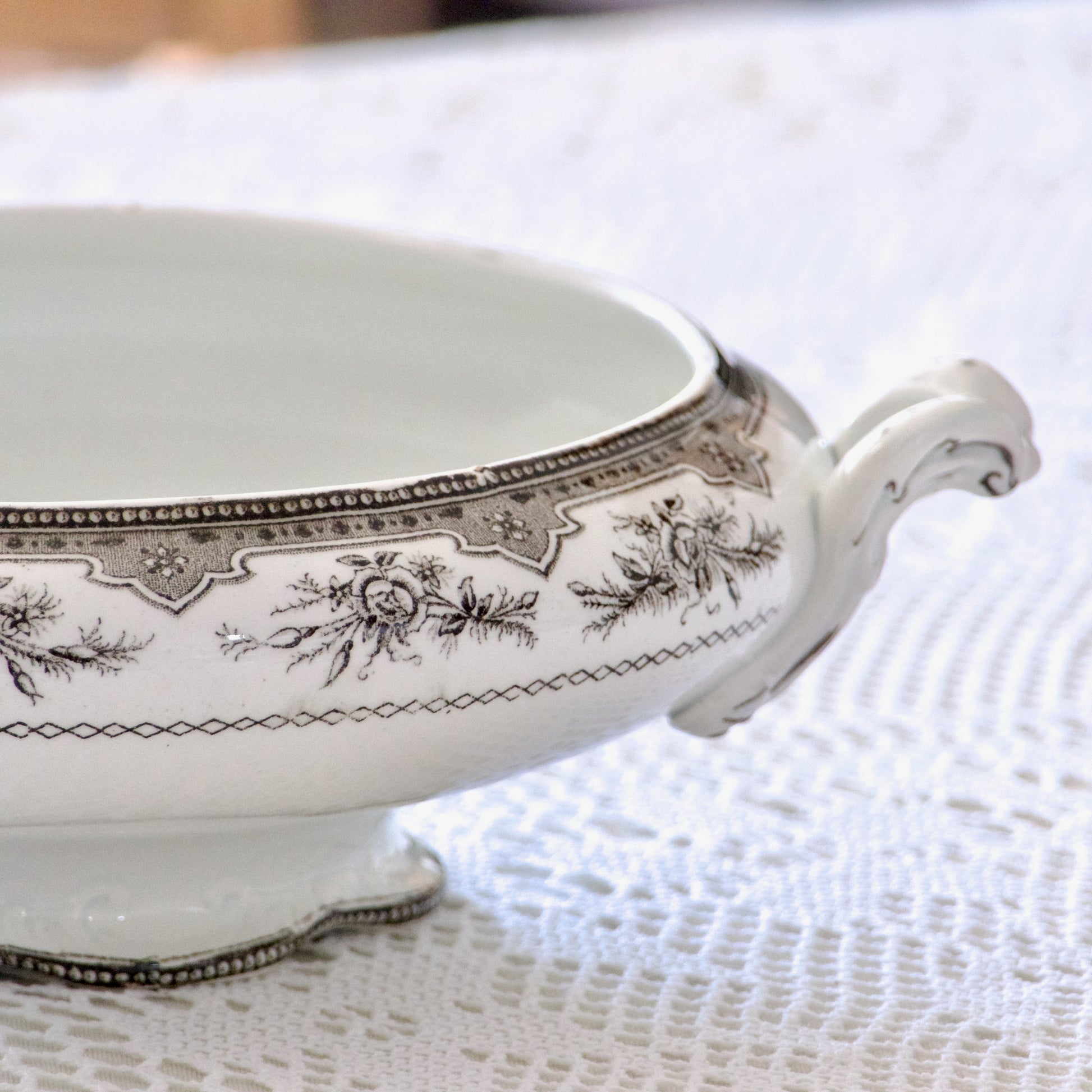 Rare et très joli légumier / saladier (anciennement soupière) ancien fin XIXe, estampillé Onnaing collection “Roses-mousses” rare couleur sépia.
