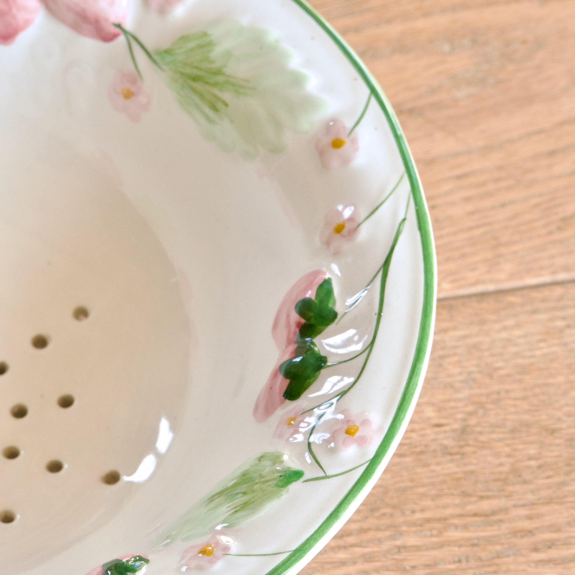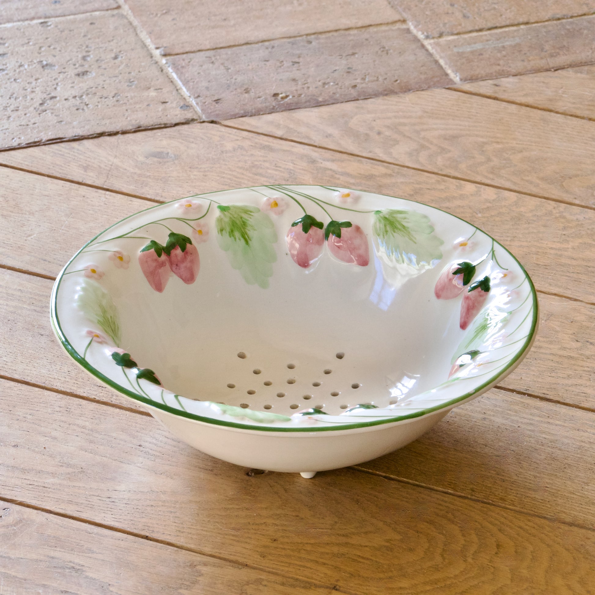 Très jolie passoire / égouttoir tripode vintage en barbotine, faïence portugaise.