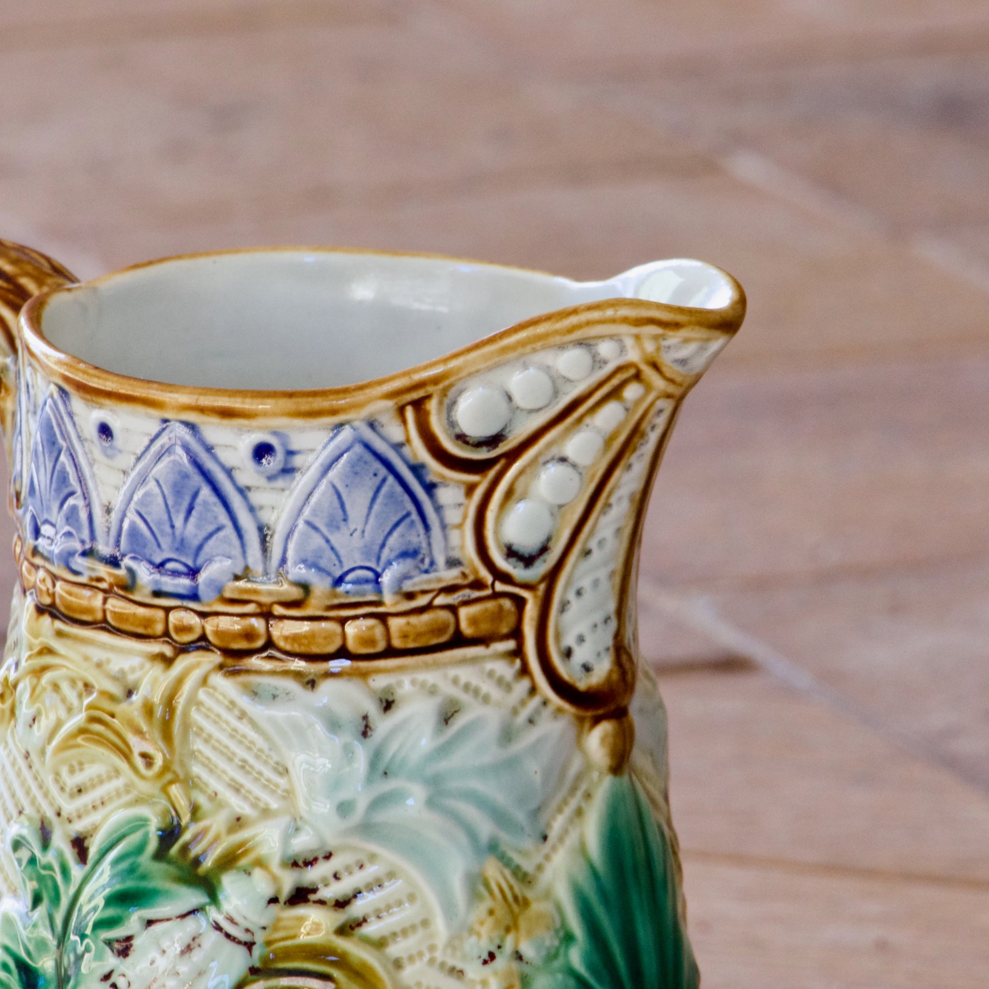Bec verseur saillant, orné d’un motif bouton floral à décor ponctué et bordure brun-ocre.
