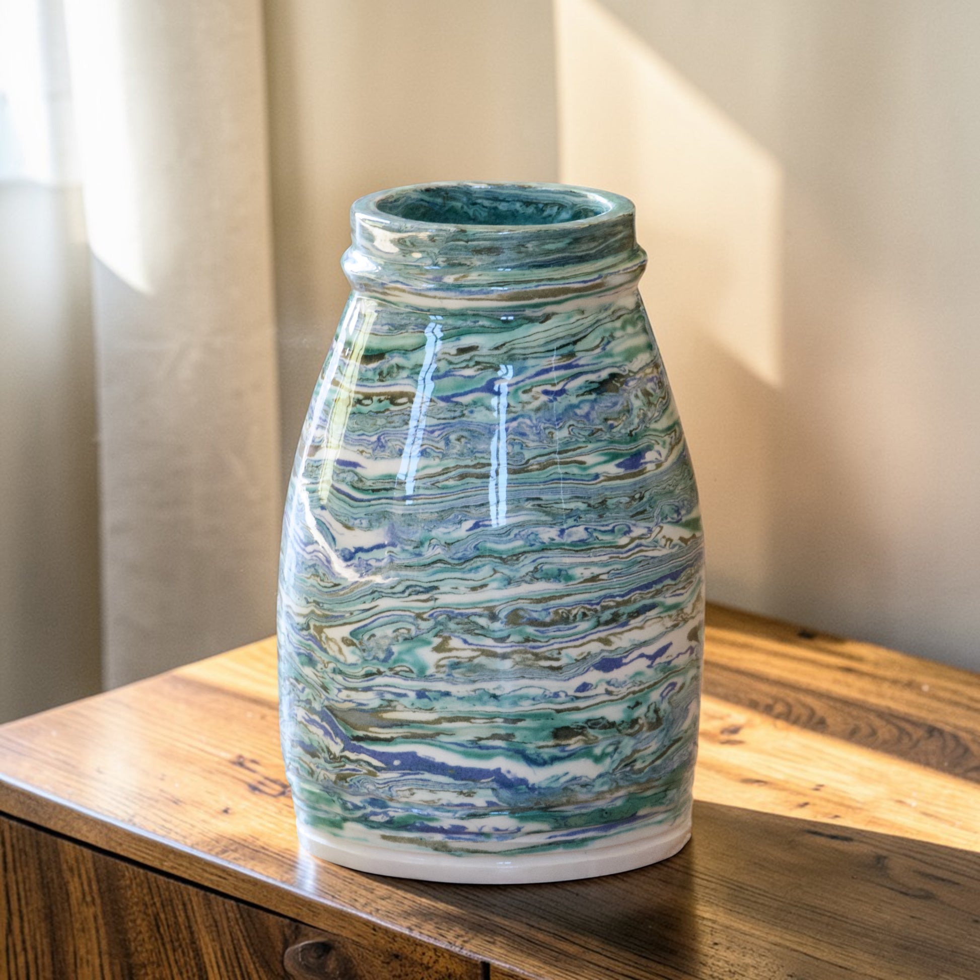 Pièce unique. Vase artisanal d’atelier contemporain, réalisé en terre mêlée, technique céramique consistant à assembler différentes terres colorées avant le tournage afin d’obtenir un décor naturellement marbré dans la masse.