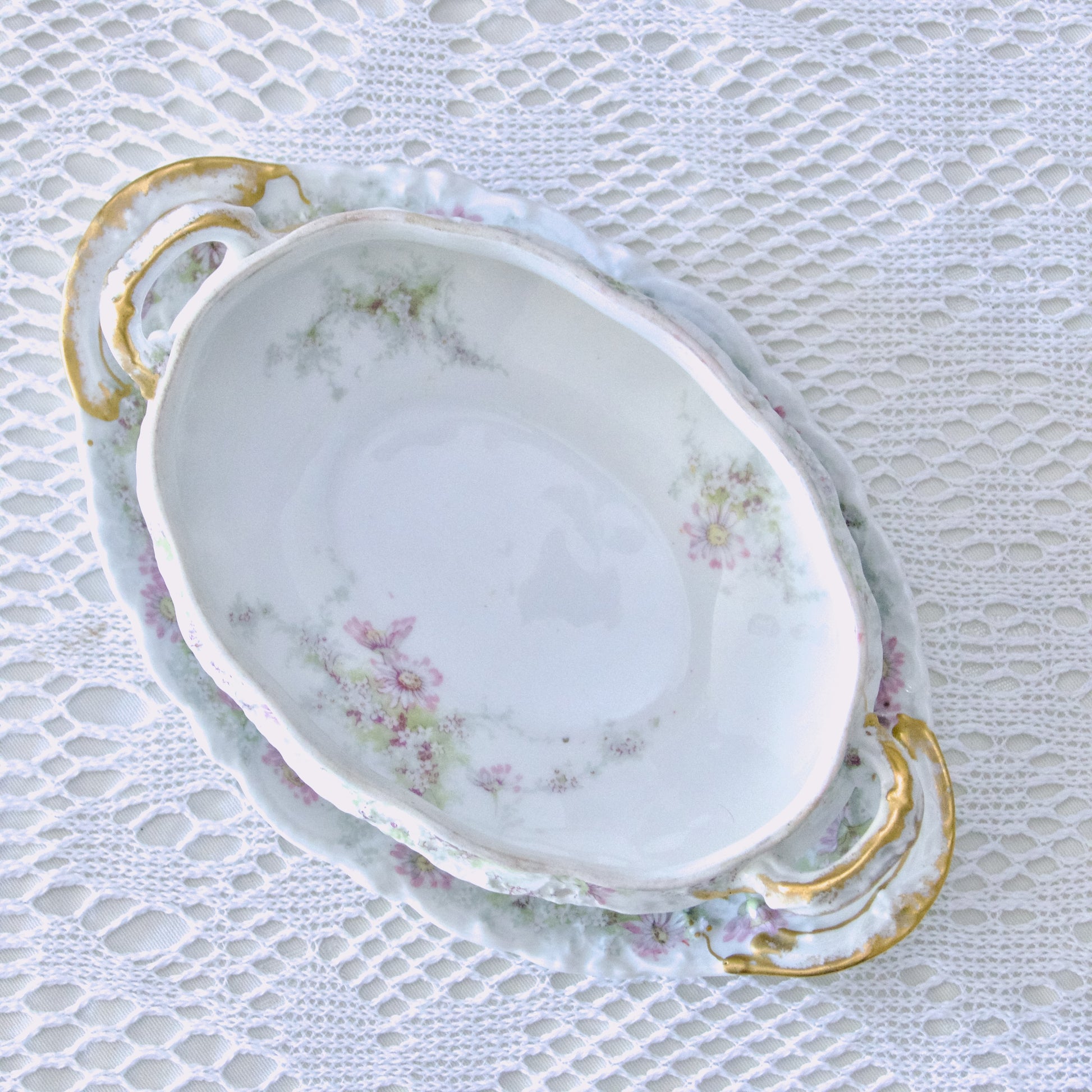 Jolie saucière sur plateau en porcelaine estampillée Emile Bourgeois Grand Dépôt, décor floral.