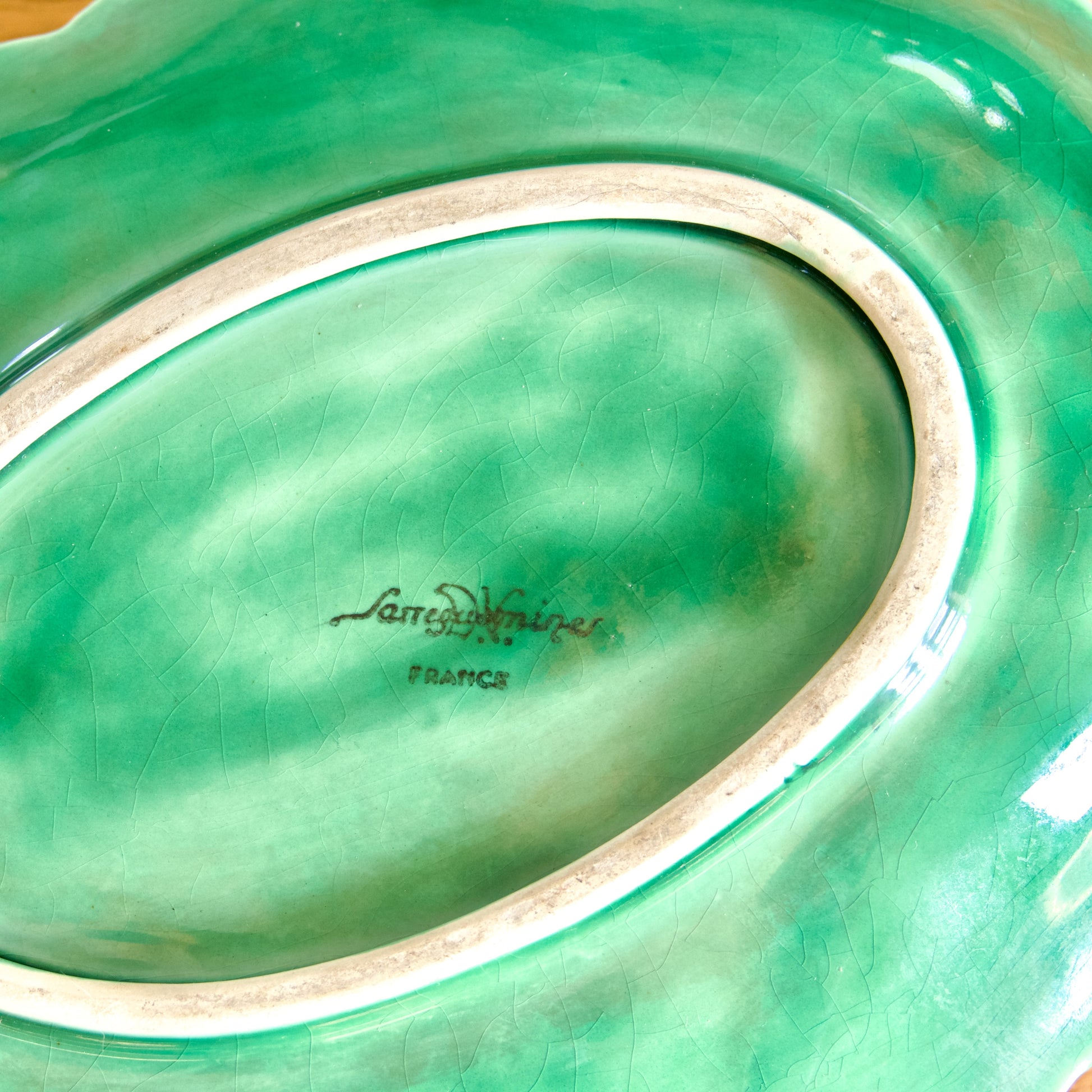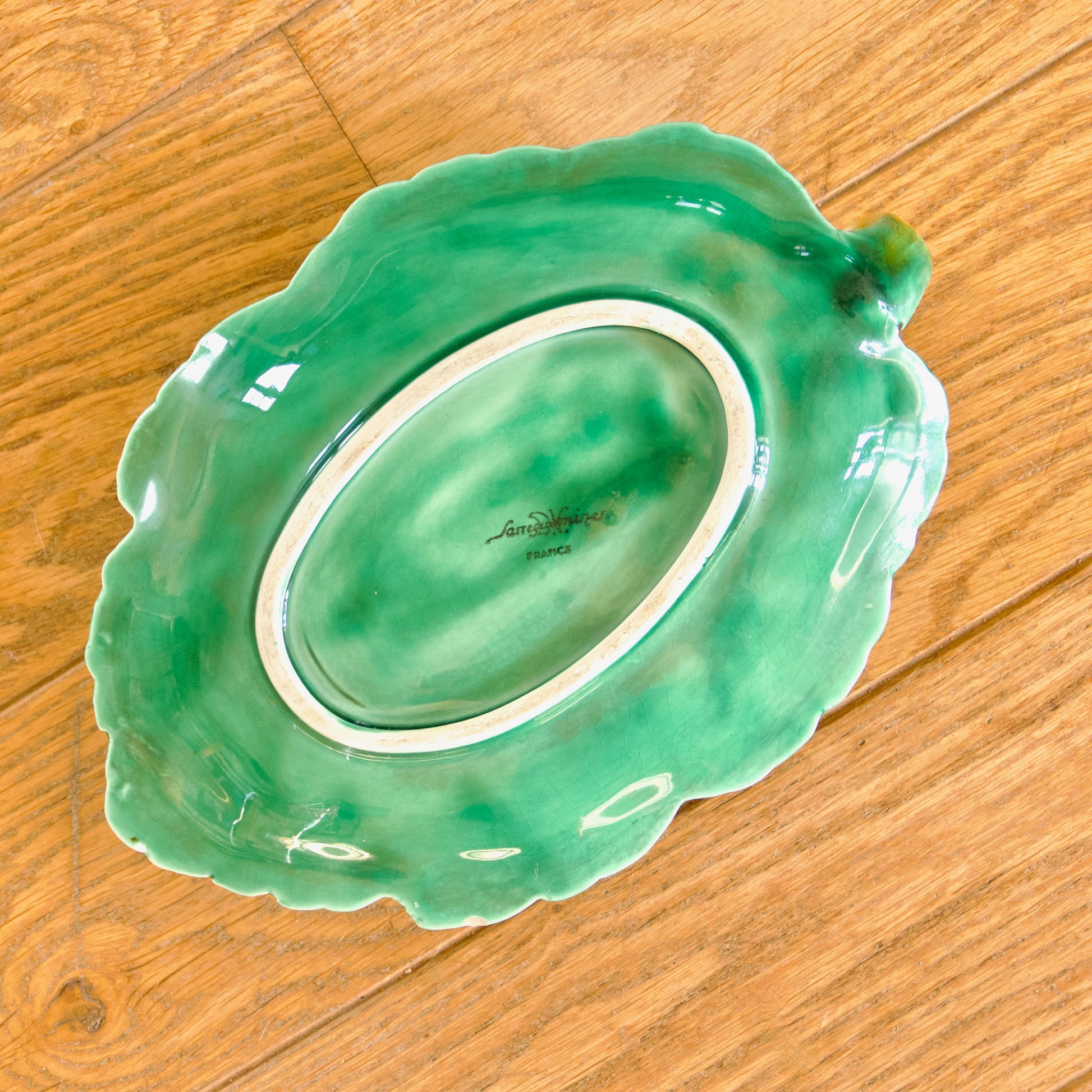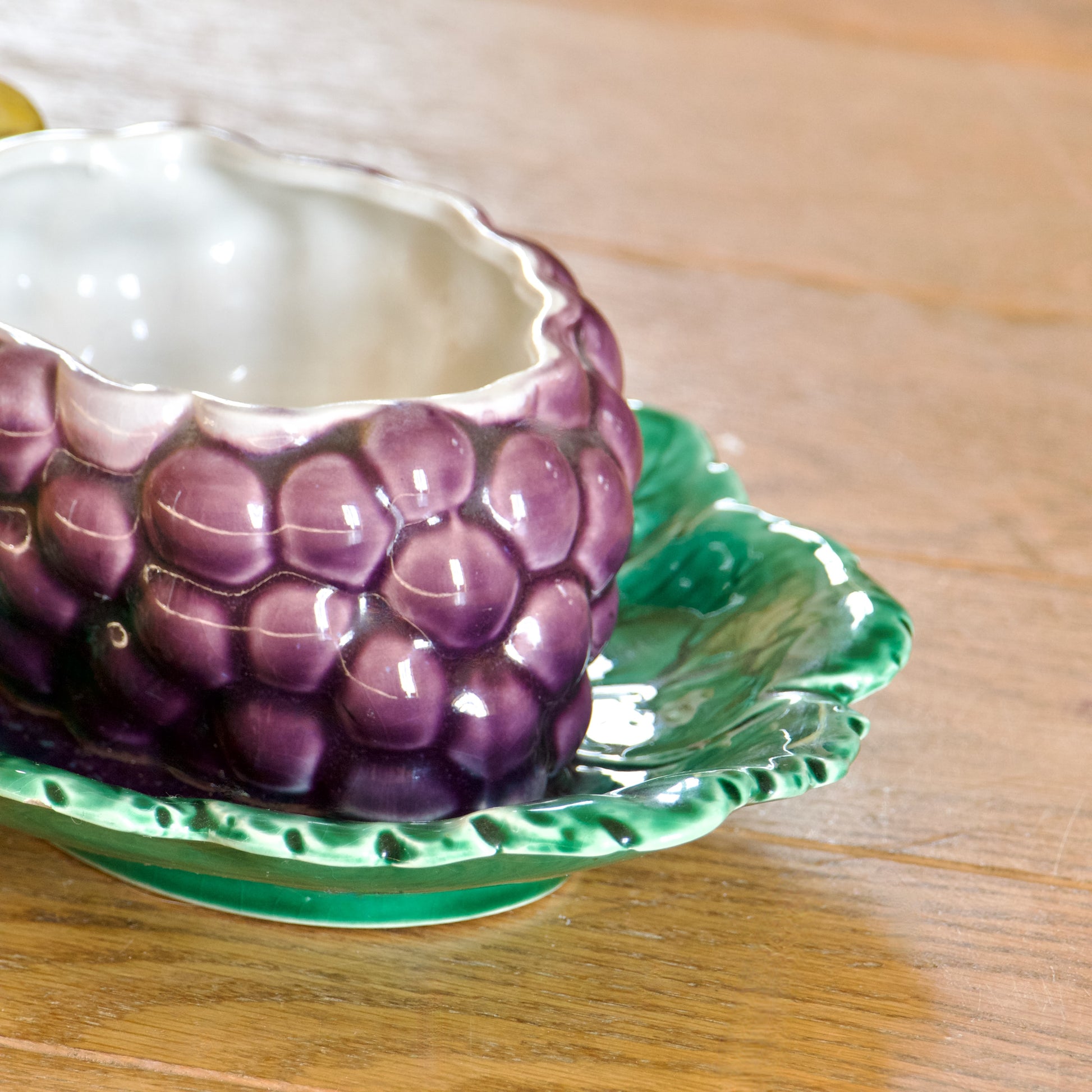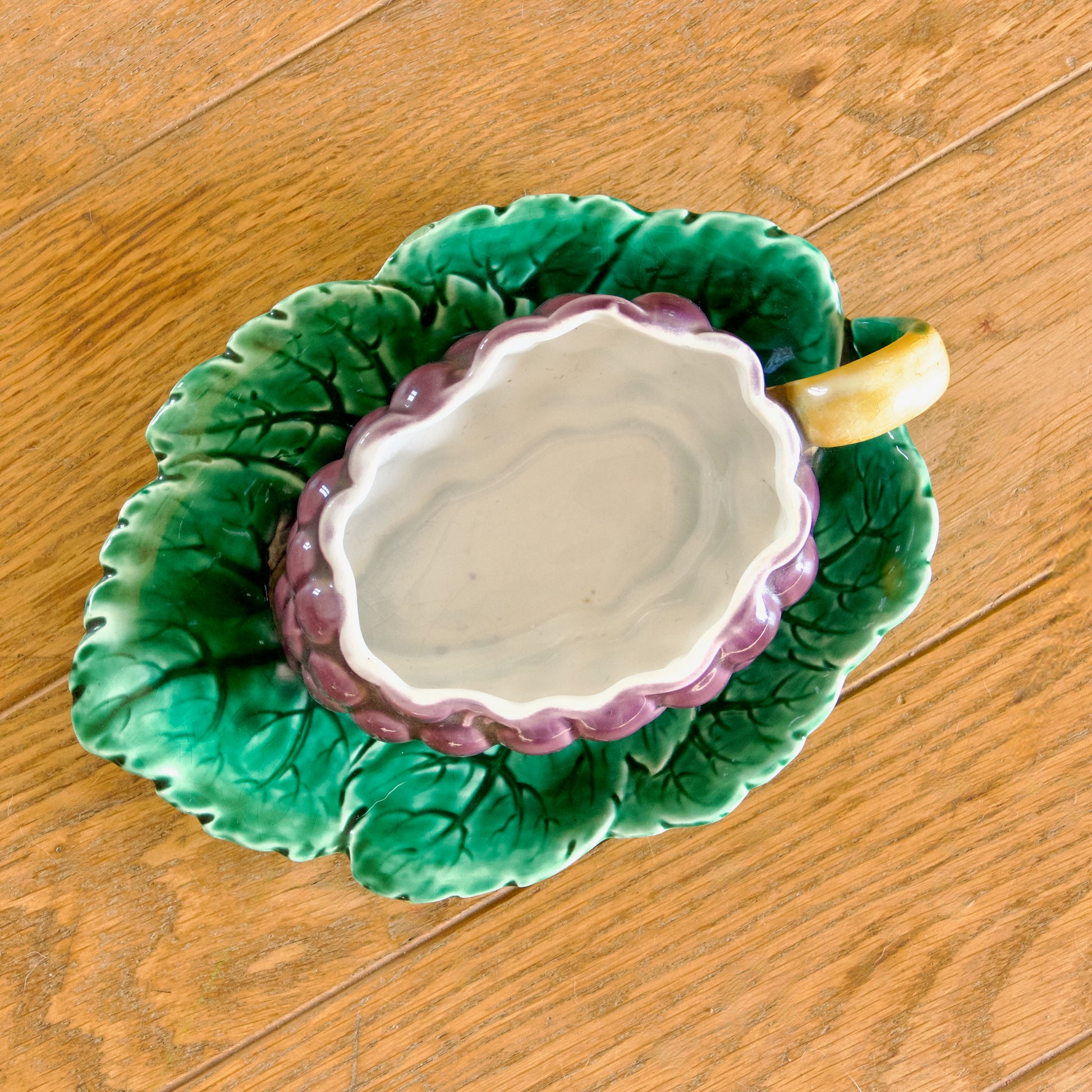 Grande saucière sur plateau ancienne, en barbotine de Sarreguemines, modèle raisin.