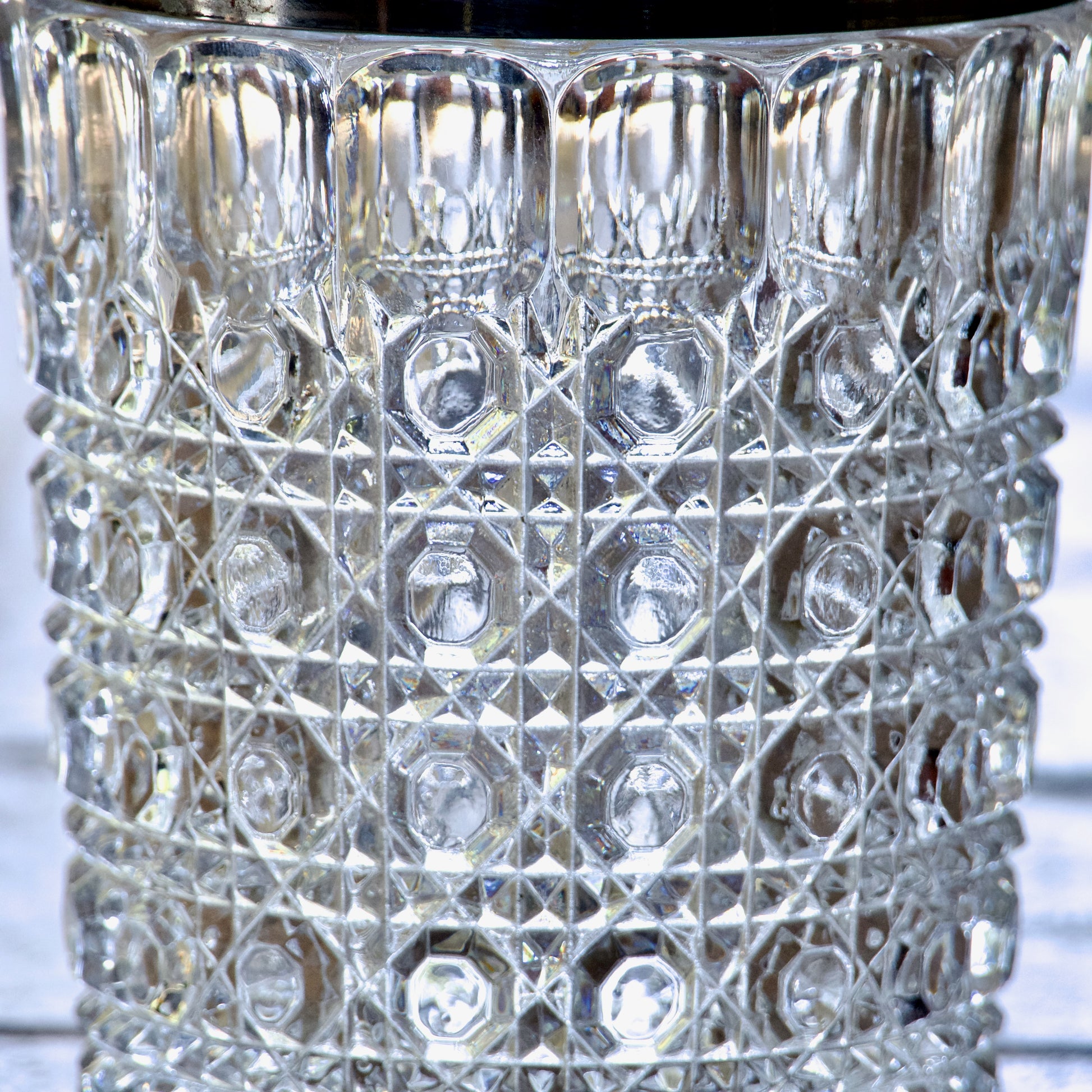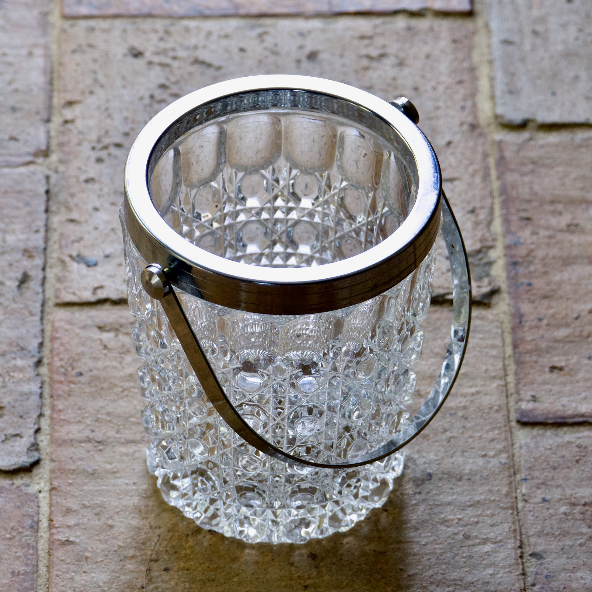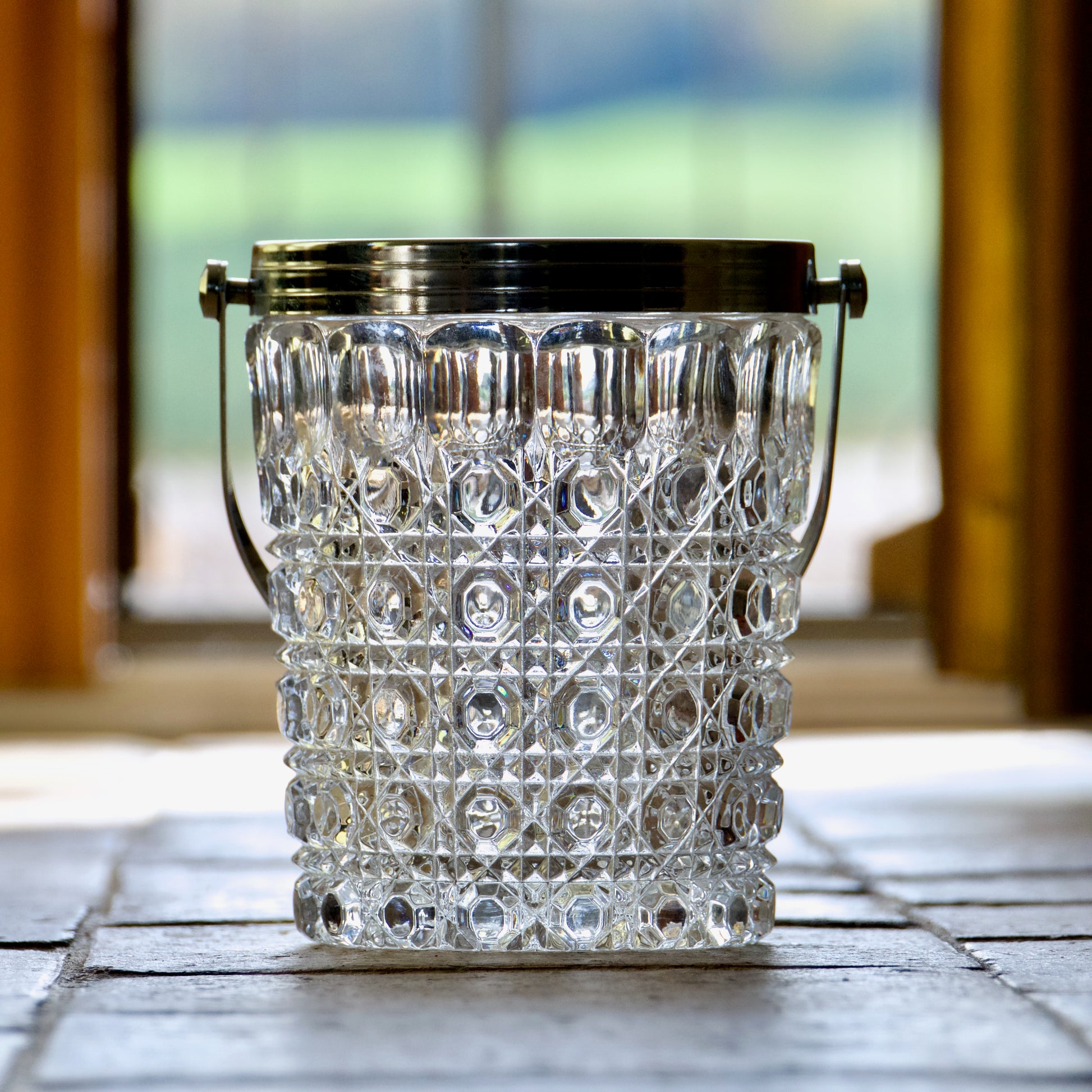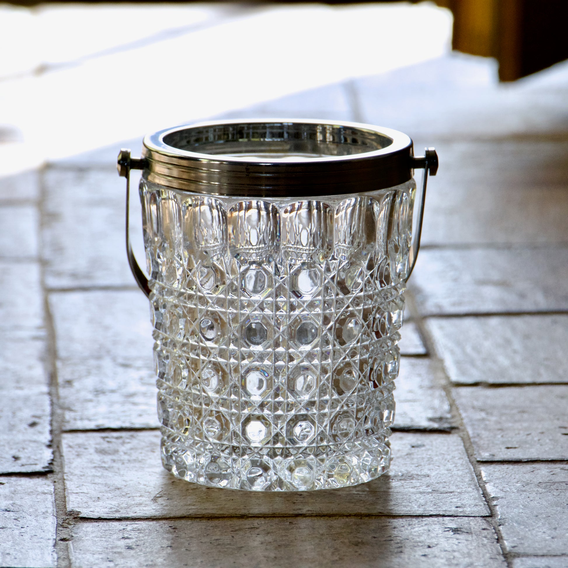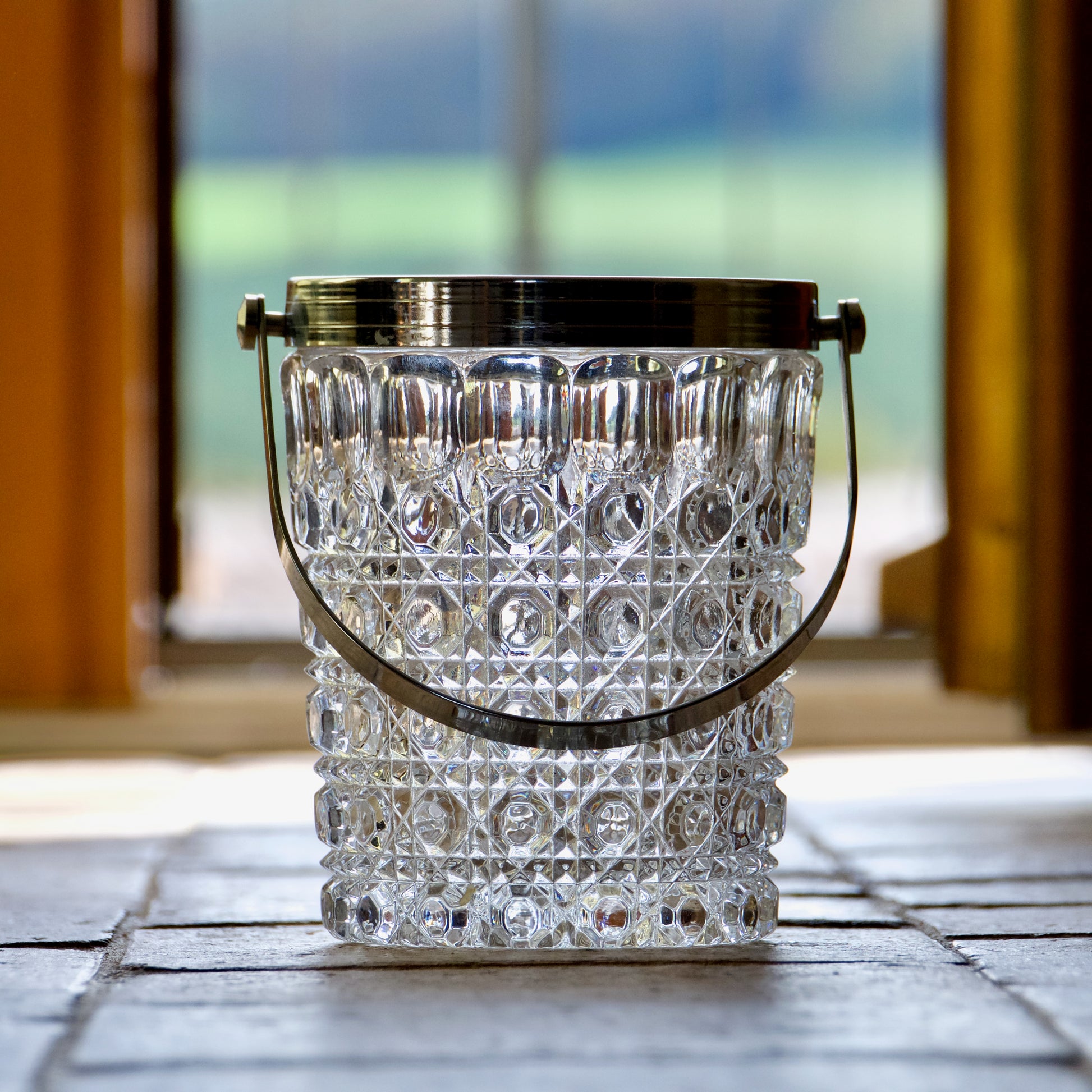 Magnifique seau à glaçons en cristal des années 1970, avec contour et anse en métal argenté.