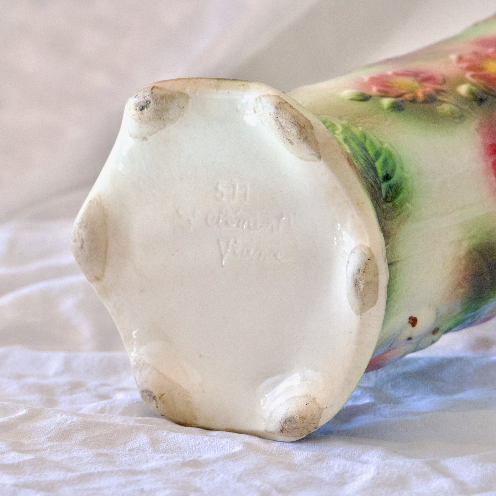 Merveilleux vase rouleau ancien en barbotine signé Saint Clément.